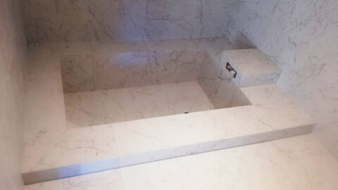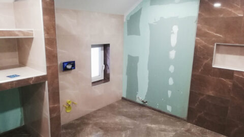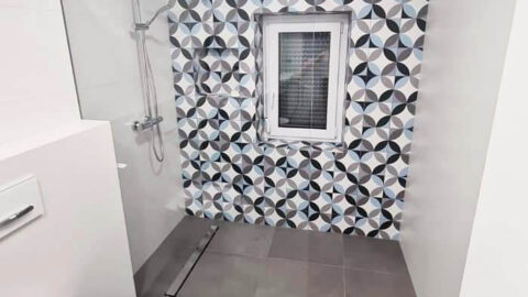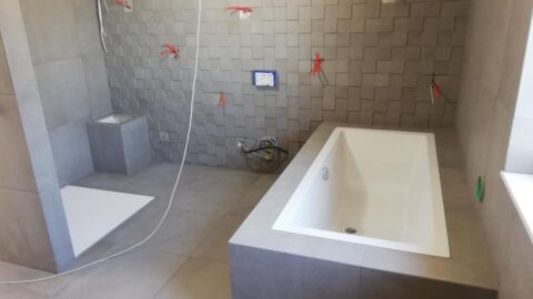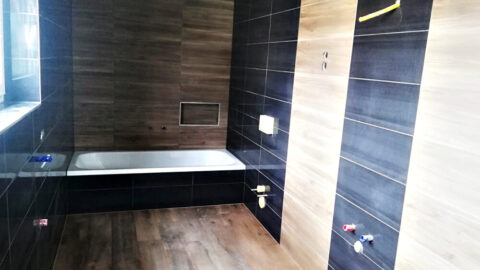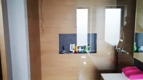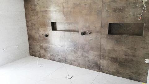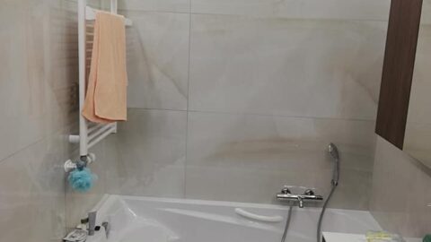 V svetli in prostorni kopalnici obloženi z velikoformatno k...